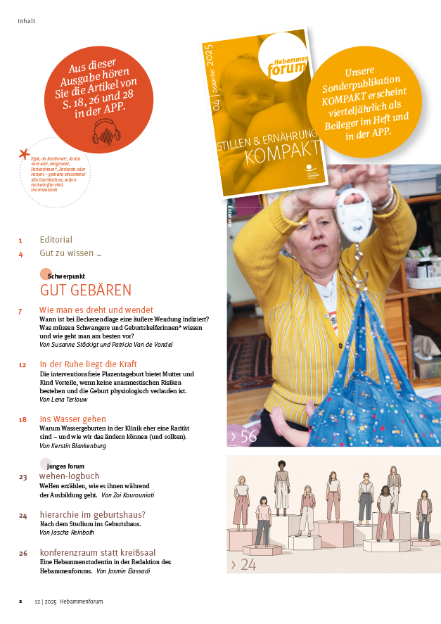 Was macht eine gute Geburt aus? Dieser Frage gehen wir in unserem letzten Schwerpunkt 2025 nach. Eine Beckenendlage muss nicht zwangsläufig eine Sectio indizieren. Dennoch lohnt sich zuvor der Versuch einer äußeren Wendung. Susanne Stöckigt und Patricia van den Vondel zeigen, wie man am besten vorgeht. Das Kind ist da, aber die Geburt ist noch nicht vorbei. Jetzt heißt es abwarten oder eingreifen? Lena Terlouw über das Für und Wider von Interventionen bei der Plazentageburt. Wassergeburten sind in Kliniken (noch) kein Standard. Warum das so ist und welche Vorteile diese bietet, erläutert Kerstin Blankenburg.