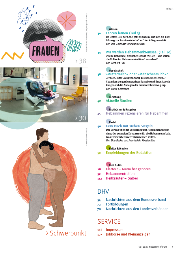 Vor 25 Jahren wurde das Hebammenforum als das Fachmagazin des Deutschen Hebammenverbands (DHV) gegründet. Seit 2025 erhalten ALLE DHV-Mitglieder das Hebammenforum im Rahmen ihrer Mitgliedschaft. So erreichen wir 23.000 Hebammen und sind damit das auflagenstärkste Fachmagazin für die Berufsgruppe. Erfahren Sie 10x im Jahr das Neuste aus Ihrem Landesverband, verfolgen Sie aktuelle Entwicklungen in der Arbeit des DHV und entdecken Sie spannende Themen rund um den Hebammenberuf. Profitieren Sie als DHV-Mitglied außerdem vom kostenlosen Zugang zum Hebammenforum Online-Archiv.