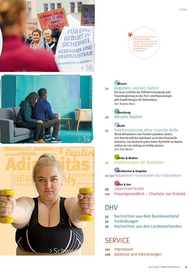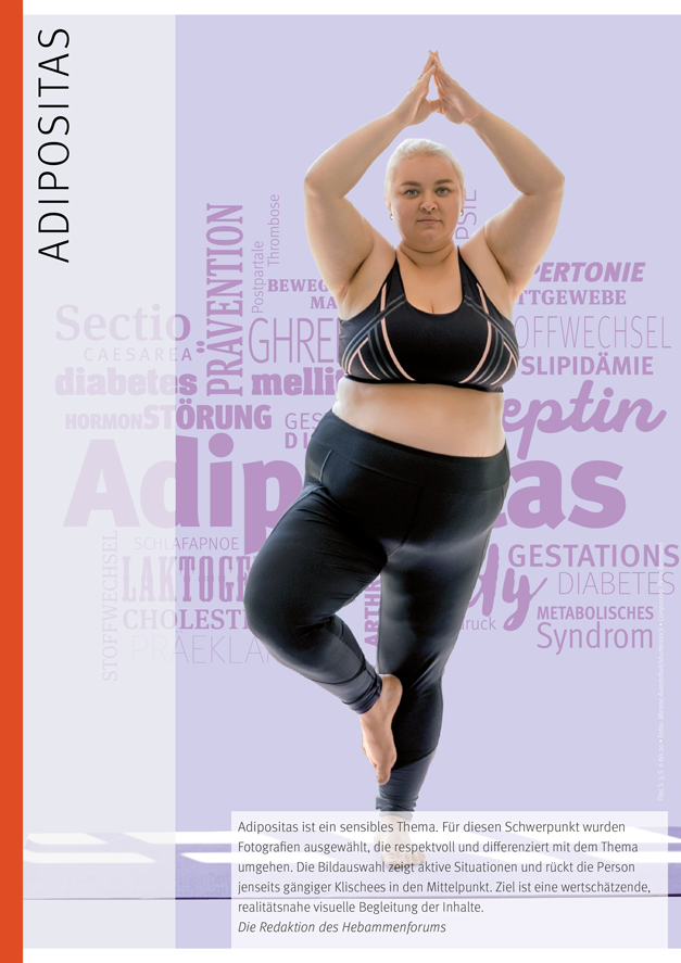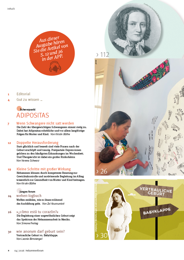 Adipositas wird von der Weltgesundheitsorganisation (WHO) als globale Epidemie eingestuft. Die Krankheit wirkt sich auf viele andere Bereiche der Gesundheit aus, besonders in Zusammenhang mit der Familiengründung. Kistin Büthe führt in das Thema ein mit Zahlen zur Häufigkeit von Adipositas bei Schwangeren und den gesundheitlichen Folgen. In einem weiteren Beitrag zeigt sie auf, wie Hebammenbetreuung hier positiven Einfluss nehmen kann im Hinblick auf Bewegungstipps, Ernährungsempfehlungen und Stressmanagement. Die postpartale Depression (PPD) ist eine der häufigsten gesundheitlichen Beeinträchtigungen im Wochenbett. Verena Schwarz stellt den Zusammenhang mit Adipositas her und plädiert für eine stärkere Betrachtung der psychischen Gesundheit in der Schwangeren- und Wochenbettbetreuung.