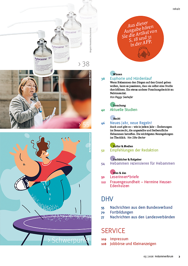 Im jungen forum: Freiwilligenarbeit in Mexiko und 150 Tage vor dem Examen – wie fühlt sich das an? Forschung: Mikrobiom, Physikalische Anwendungen zur Schmerzlinderung und Kangoroo Mother Care; Recht: Aktuelle Änderungen im Steuerrecht; Nachrichten aus dem Deutschen Hebammenverband: Interview mit Ulrike Geppert-Orthofer und Annika Wanierke, Bericht von der HebaPäd, Kooperation mit der Gewerkschaft Komba, Neues vom Hebammenkongress uvm.